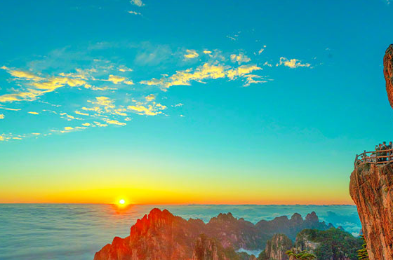 "云海 "可以说是游客们最想看到的奇观。 黄山之旅.当低垂的云层布满山谷时,这种现象就会出现,使山峰看起来就像漂浮在茫茫大海中的岛屿。这种现象在春季和雨后最为常见。为了增加看到日出的机会,请安排在雨季游览,并做好早起看日出的准备。